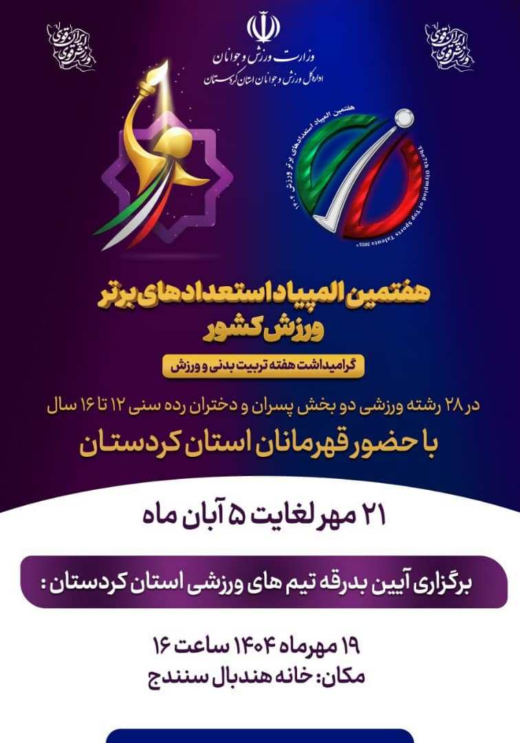 در روز جمعه، ۲۸ شهریور ۱۴۰۴، مسابقات انتخابی المپیاد استعدادهای برتر کاراته در سنندج برگزار شد. نوجوانان کاراته کای استان کردستان در مجموعه ورزشی تختی در دو بخش کومیته و کاتا و در ۴ رده وزنی مختلف با هم رقابت کردند.هدف از این مسابقات: انتخاب و اعزام بهترین ورزشکاران به مسابقات کشوری المپیاد اس...